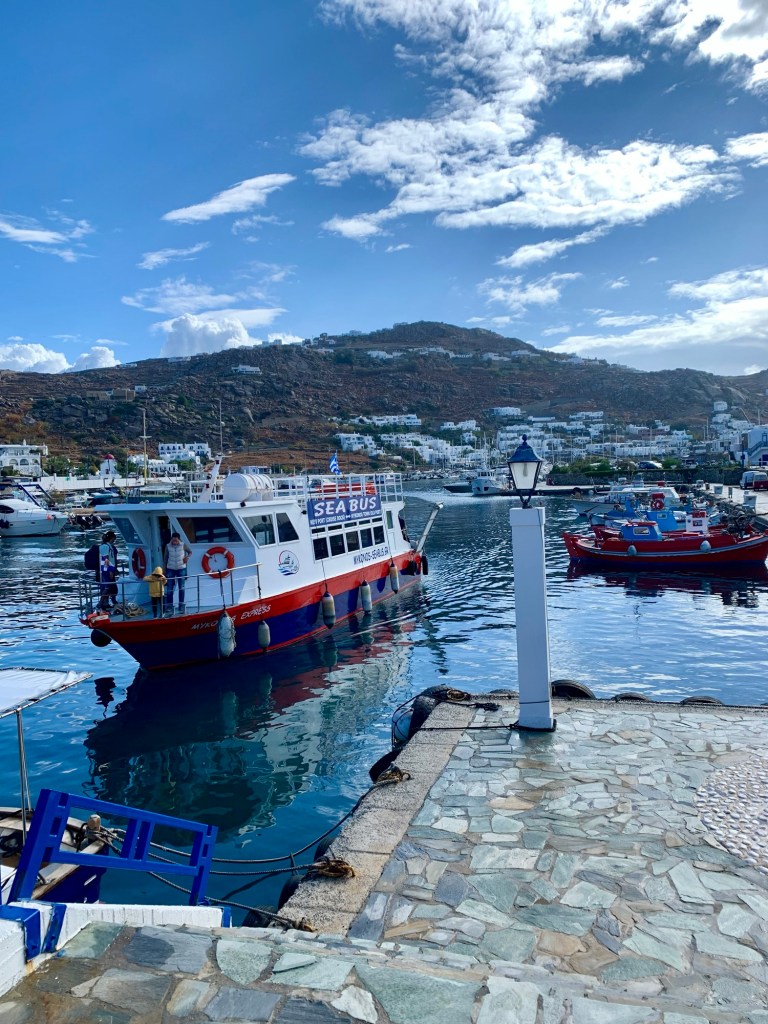 When we arrived, most passengers had pre-arranged transportation waiting at the ferry terminal, but I hadn’t planned that far ahead. As I started walking toward the road to look for a bus, I noticed a small fleet of sea buses at the far end of the dock, shuttling foot passengers to Old Port and Mykonos Town. I wasn’t exactly sure where it would drop me off, but it seemed like a more interesting option, so I hopped on and picked a stop that looked close to my hotel—or so I thought.