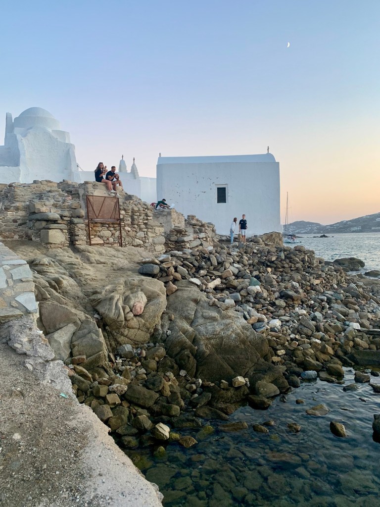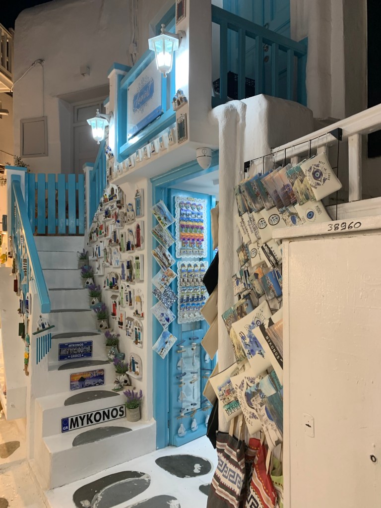 Walking around Mykonos Town felt exactly like what I had pictured—classic cobblestone streets, white buildings with blue accents, and narrow, winding alleys that made it easy to get a little lost. The town sat right on the water, with waves crashing up against the walls in some spots and seaside restaurants lining the edge in others.