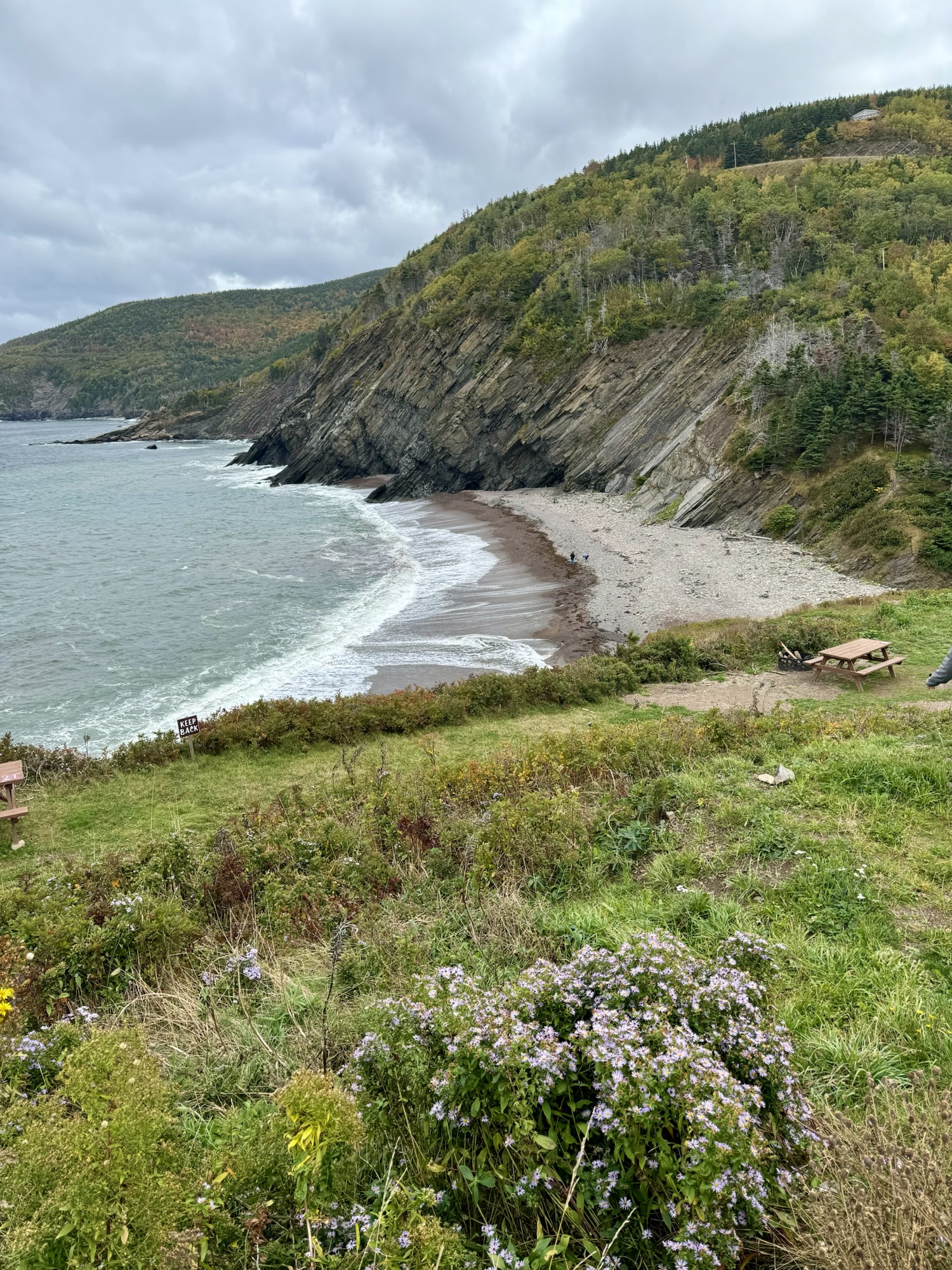 The next day, we made a scenic detour up to Meat Cove, the northernmost tip of Cape Breton, to get Julie a famous lobster roll from Lawless Lobster. The winding roads hug the cliffs, offering glimpses of the coastline and Atlantic below. After a little bit of a harrowing drive, the food truck sits on top of this dramatic cliff where we had lunch before going down to enjoy the rock beach and waves below.