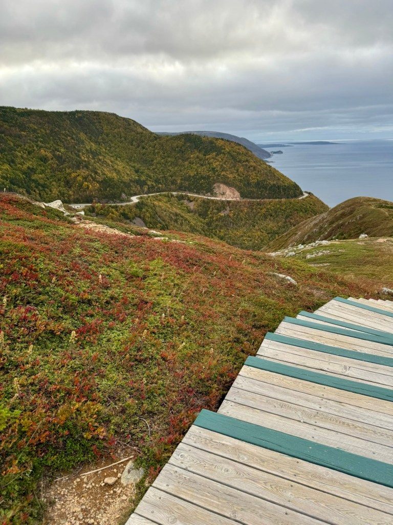 One of the highlights was hiking the Skyline Trail, one of the most iconic and scenic trails in Cape Breton Highlands National Park. The trail sits high above the Cabot Trail near French Mountain and is known for its dramatic coastal views where the mountains seem to meet the sea. It’s a loop of about 6.5–8.2 km, with a mostly gentle path and a famous boardwalk section leading to a headland lookout that offers sweeping panoramas of rugged cliffs, forest, and the Atlantic beyond.